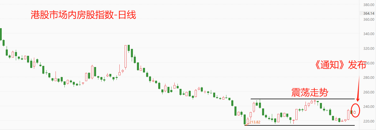 受《通知》发布的影响,港股市场内房股(内地房地产股票)出现异动。截至上午盘收盘,内房股指数上涨1.4%,今日有望创出本周新高。在此之前,本周二内房股指数已经出现5.65%的涨幅,市场的乐观情绪显著回升。需要提醒的是,从长周期来看,内房股指数报价处于近三年以来的底部区域,内房股指数的长期空头趋势并没有因为《通知》的发布而出现实质性变化。
