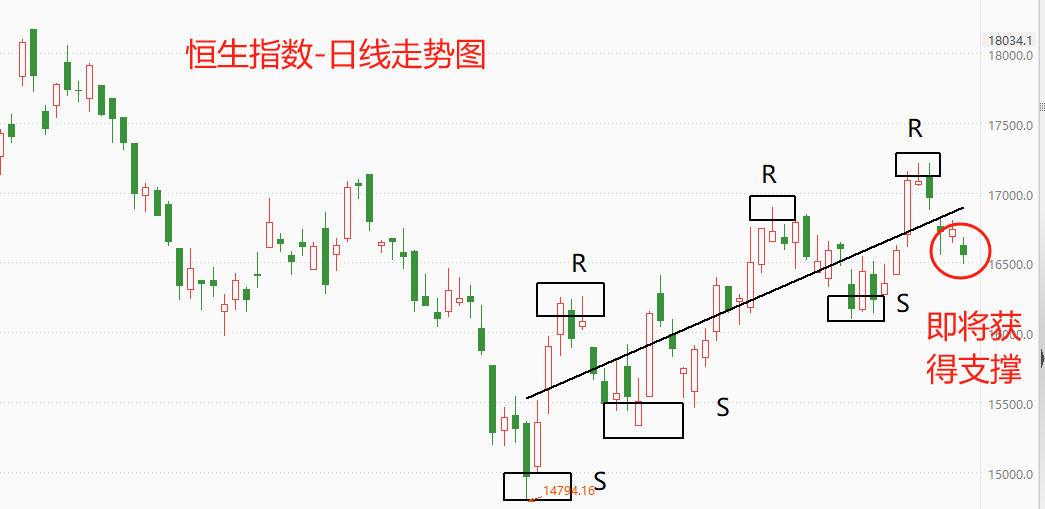 上图为恒生指数日线级别走势图。技术角度看,虽然受到内房股板块的拖累,但恒生指数可能即将获得技术性支撑。市价已经处于黑色回归线下方,一旦底分形结构形成,则触发回归线的向上牵引力。下方支撑位16095.7,预计底分形将会在该价位上方形成。如果后市发展符合预期,恒生指数上行目标位或许将达到甚至突破17214.7点。