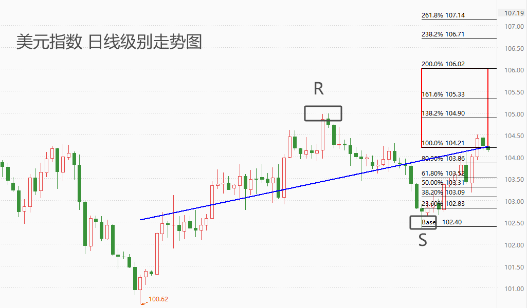 上图为美元指数的日线级别走势图。技术角度看,美元指数处于稳步上涨波段中,下方支撑位102.4,上方第一阻力位104.9,第二阻力位105.33。市价已经与蓝色回归线重合,昨日和今日的两根小阴线表明回归线对市价造成压力。不过,以当前稳定上涨的趋势来看,美元指数继续走强并触及第一阻力位的概率更高。
