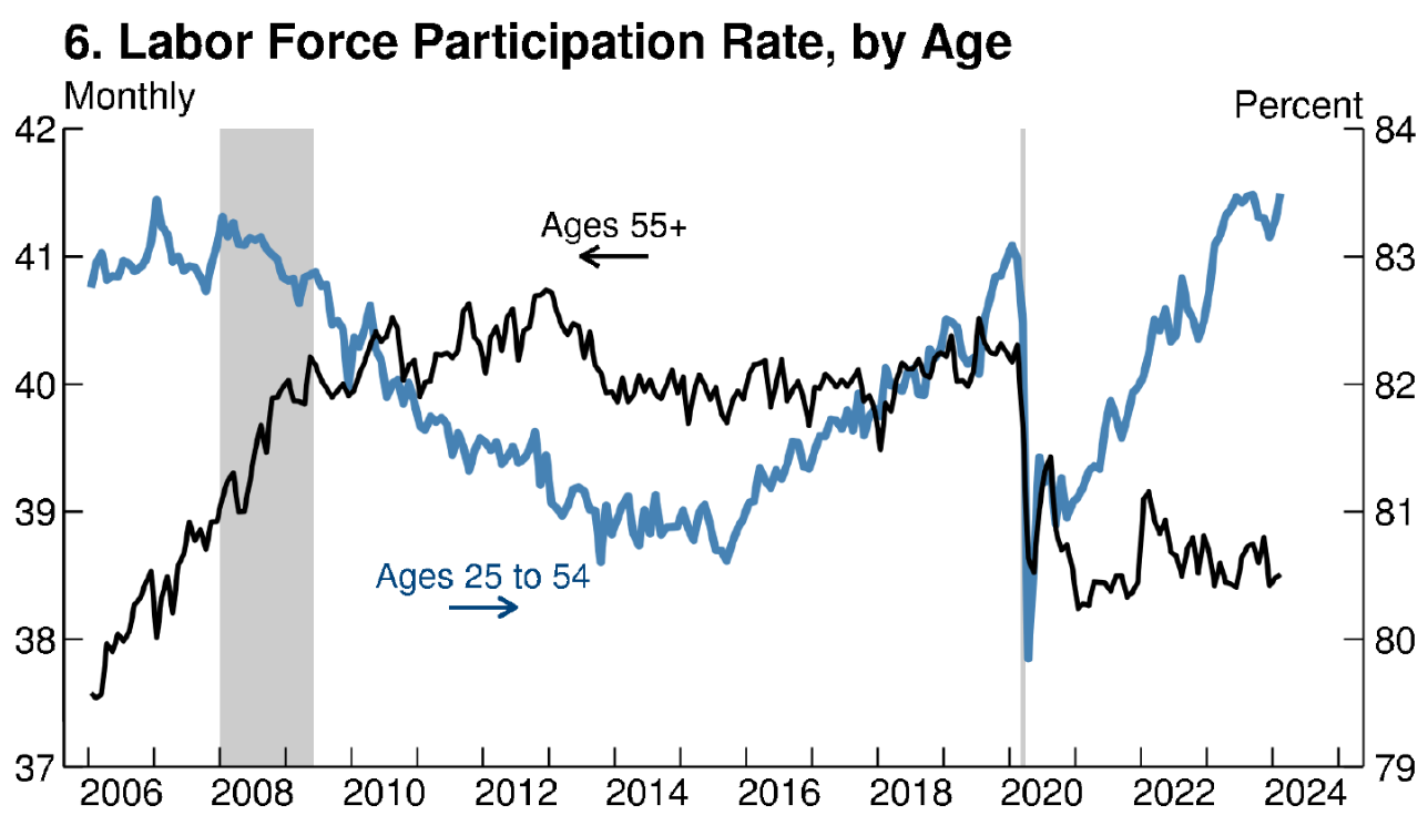 对于促进就业来说,美国的最新失业率为3.9%,国际公认的自然失业率标准为4~6%,美国的失业率数据处于标准之下,意味着劳动力市场处于健康状态。实际上,3.9%的失业率,处于有数据记录以来的底部区域。上图为“按照年龄段划分的美国劳动力参与率”曲线。可以看出,经过2020~22的大流行影响后,25~54岁的就业人群的劳动参与率显著升高,从81%以下上升至83%以上。相反55岁以上的就业人群的劳动参与率显著下降,从82%以上下降至81%以下。55岁以上的就业人群,往往存在健康问题,大流行之后退出劳动力市场符合预期。对于25~54岁的劳动人群来说,劳动参与率的提高,意味着当前美国的就业市场比较火热。正是给予对劳动力市场的乐观判断,Cook才会得出“谨慎放松货币政策”的结论,因为旺盛的劳动力需求,往往导致较高的潜在通胀率。