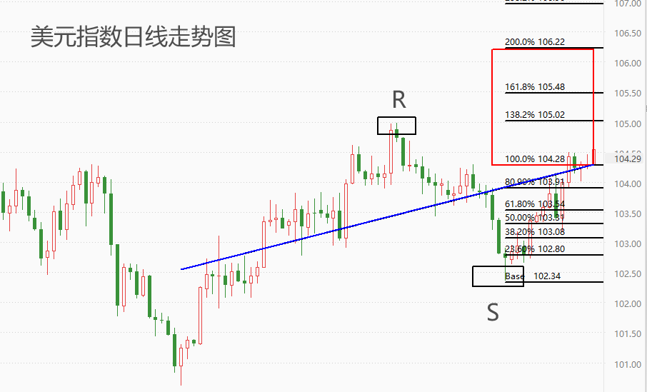 上图为美元指数的日线级别走势图。技术角度看,美元指数处于中期上涨波段之中,受沃勒讲话影响,今日盘中出现中阳线,市价可能会有效站上蓝色回归线。对于本月的中短期上涨波段来说,下方支撑位102.34点,上方第一阻力位105.02,第二阻力位105.48,第三阻力位,也是最终目标位106.22 。达到第三阻力位时,蓝色回归线极有可能发挥向下的牵引作用,导致美元指数遇阻回落。