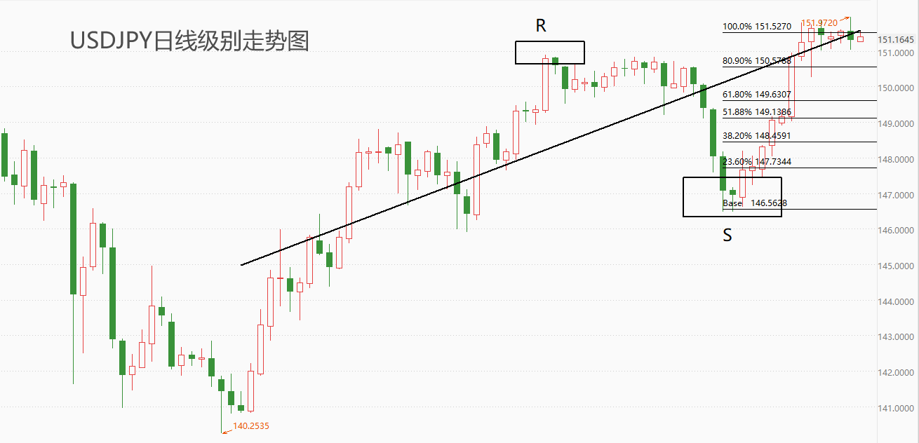 近期受到密切关注的品种还有美元兑日元。昨日,USDJPY冲高至151.972点,创出有记录以来新高。日本财务省负责国际事务的副大臣神田真人表示,“日元当前的贬值与基本面不符,显然是受投机行为驱动,我们将针对汇率过度波动采取适当行动,不排除任何选项。”能够引起日本财务省的注意,意味着日元的汇率已经处于“极端水平”。但是,从技术角度看,USDJPY仍具有继续上行的动力,一旦黑色回归线上方出现决定性的长阳线,USDJPY或许将开启新一轮强势上涨波段。