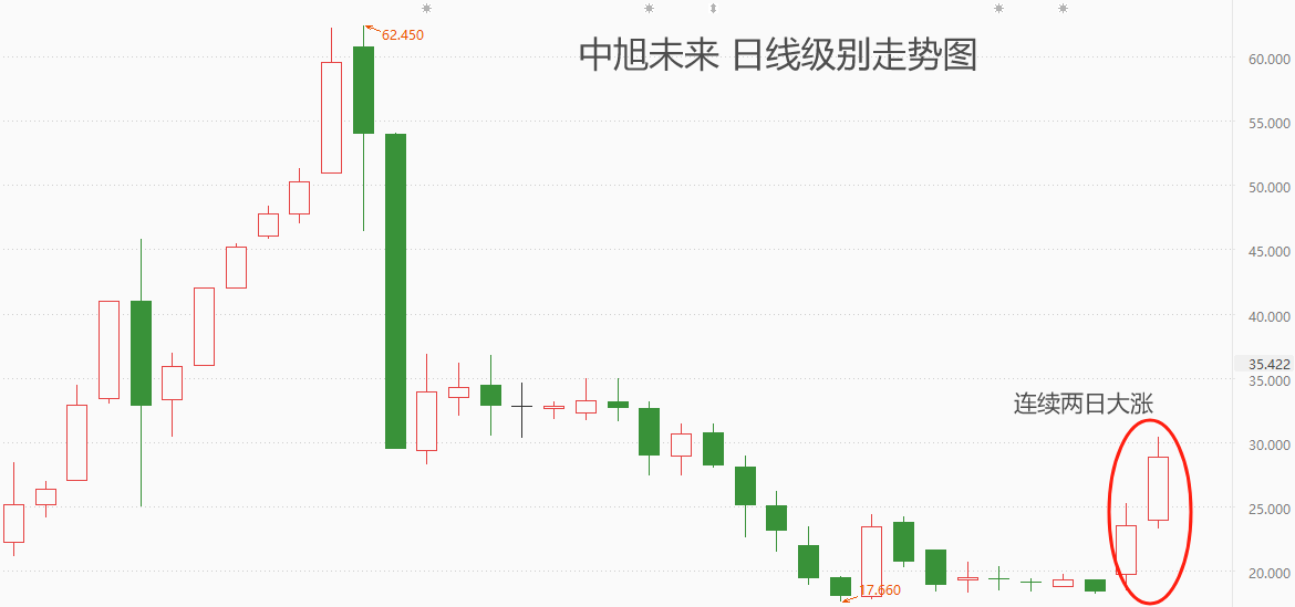 上图为中旭未来日线级别走势图。技术角度看,股价走势的中期趋势依旧偏空,近两日大涨之前,股价有横盘震荡特征。由于消息面并没有明确的利多消息,所以本轮股价暴涨能持续多久,仍存在较大不确定性。拉长周期看,3月1日股价曾大跌45.37%,2月2日更是出现76.4%的巨幅阴线,表明其股份持有者不够分散,主力动向对股价影响太过显著,持有风险偏高,不建议资金薄弱的交易者参与。大盘角度看,恒生指数虽然反弹走势不够顺畅,但整体向上的格局仍在维持,市场情绪较为乐观,对中旭未来的后续涨势提供了一定助力。