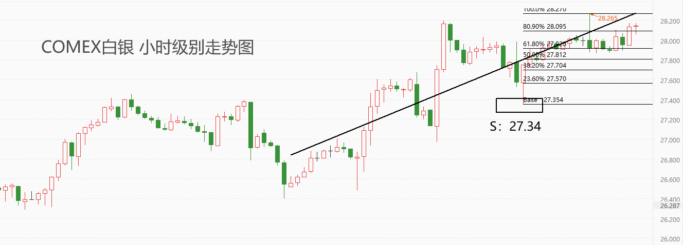 小时级别来看,COMEX白银的上涨结构良好,目前受到中期支撑位S:27.34的托举而向黑色回归线移动。如果后市有效站上回归线,则新一轮上涨幅度约在0.92美元左右(以回归线和K线交叉的点作为起涨点)。自上周五美国非农就业报告公布之后,美元指数一直处于回调态势,这对COMEX白银的短期涨势形成显著提振,同时也增强了短线资金入市的信心。