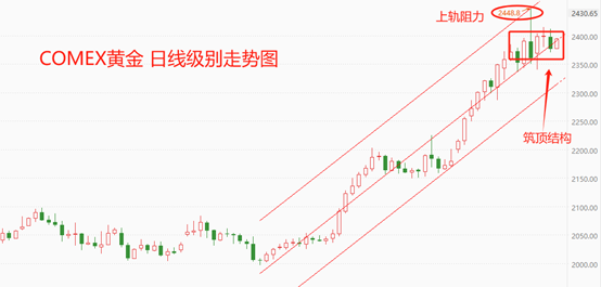 上图为COMEX黄金日线级别走势图。技术角度看,经过一轮快速上涨之后,COMEX黄金价格已经来到了阻力区。通道线上轨已经在4月12日被触及并在当日形成长上影线,这是阻力位有效的典型特征。最近七根K线呈现出横向排列,重新触及上轨阻力的难度较大,筑顶结构较为显著。后市观察是否会有决定性长阴线出现,一旦出现,则意味着筑顶完成。中短期支撑位在下轨附近,约为2320一线。如果俄乌、巴以等问题没有出现局势升级迹象,下轨支撑的作用可能不明显。