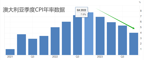 本周三9:30,澳大利亚统计局将公布第一季度CPI年率,前值为4.1%,预期值3.5%,预期将下降0.6个百分点。历史数据看,澳大利亚的季度CPI年率在2022年四季度达到顶峰,最大值7.8%。至今的五个季度里,年率增速持续下降,最低值4.1%,平均每个季度下降0.74个百分点。本次市场预期CPI年率降幅0.6个百分点,约等于平均降幅,预期达成概率较高。需要提醒的是,除了季度CPI年率数据之外,澳大利亚统计局还发布月度CPI年率数据。历史数据看,最近三个月的CPI年率增速均为3.4%,呈现出明显的震荡态势。所以,今年一季度的澳大利亚CPI年率增速,有一定概率与前值持平。