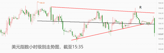 下图为美元指数小时级别走势图。由于刚刚公布的德国PMI数据表现良好,所以美元指数受到欧元走强的反向抑制而快速下跌。技术角度看,下方的红色支撑线已经与稍早的K线交叉,支撑位不再发挥作用,后市跌幅可能较大。上方阻力位是图中R所在上轨线,当前最新值约为106.3点。最近200根线来看,行情整体呈现出震荡态势,即便美元指数短期有回落风险,在中期仍有较大概率触底反弹,并最终向黑色回归线运动。