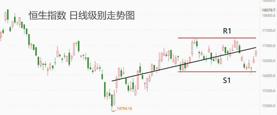 上图为恒生指数日线级别走势图。目前股价仍处于中期反弹阶段,本周两个交易日均以阳线收盘,反弹有加速迹象。下方支撑位S1经验证有效,行情触底反弹。当前市价运行于黑色中轨附近,当前动能充足,向上突破概率较高。第一阻力位是R1,报价约为17231点。如果当前的上涨节奏能够保持,我们预计,R1被突破后涨势可能还会延续一段时间。