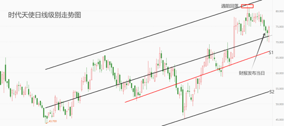 上图为时代天使日线级别走势图。去年10月份至今,时代天使股价一直处于上涨波段,期间经历过两次显著回调,但都没能破坏多头趋势结构。今年4月3日触及通道线上轨阻力位,随后遇阻回落,直至今日股价仍处于回调波段。上周五发布年度财报之后,本周一行情先回落,之后触底反弹,留下长下影线。截至今日12:20,盘中K线收阳,再次留出长下影线。连续两次下影线的形成,意味着底部支撑力较强,短期资金踊跃入场,后市行情发展比较乐观。第一支撑位是图中S1位置,约为67港元;第二支撑位在图中S2位置,约为54港元。需要提醒的是,虽然短期行情受到通道中轨和年报的支撑而反弹,但中期的回落走势仍将延续,未来像S2逼近是大概率事件。