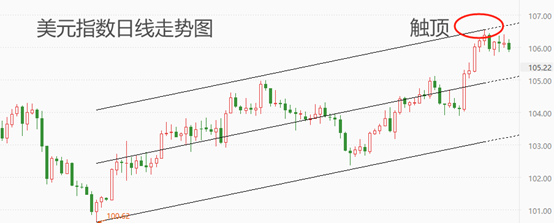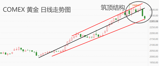 上图为COMEX黄金日线级别走势图。图中黑色圆圈内为近期回落走势,如果今日收盘价位于通道下轨下方,意味着筑顶结构完成,后市延续回落走势的概率较高。如果行情在下轨线处获得有效支撑,则后市将围绕黑色回归线继续螺旋上涨。