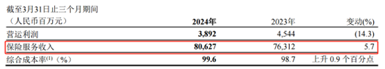 今年一季度,财产保险实现38.92亿元营运利润,相比2023年一季度的45.44亿元略有下降。保险服务收入806.27亿元,同比显著增长5.7%。保险服务收入增加而利润下降,主要是受到了一季度暴雪灾害等极端天气频发的影响。
