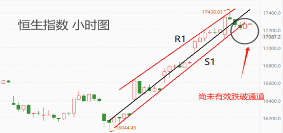 上图为恒生指数的小时级别走势图。小时级别出现近期难得一见的单边涨势。虽然日线级别已经运行到震荡区间的上轨位置,但小时级别的报价仍未跌穿上涨通道的下轨S1,意味着行情仍有进一步走高的可能。在多空转折的临界点,消息面和数据面的变化将会对后市发展起到决定性作用。