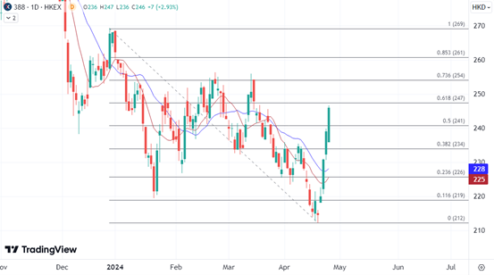 在昨日绩后港交所午后一度升逾4%,此前技术上出现十字星后,配合消息面的利好,股价连升三个交易日,日内低开但继续高走,盘中上涨近3%,录得逾一个月的最高位,继续以自2月底以来的高位在256港元为目标和关键阻力位。
