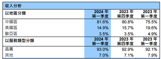 分地区看,中芯国际81.6%的销售收入来自中国区,14.9%的销售收入来自美国区,只有3.5%的销售收入来自欧亚区。和2023年一季度比较,中国区的销售占比增长6.1%,美国区销售收入占比下降4.7%,欧亚去的销售收入占比下降1.4%,除了中国区外,其它销售大区均出现销售收入占比下降的情况。分产品看,晶元生产的销售收入占比达到93%,其中智能手机的晶元占比31.2%,电脑和平板的晶元占比17.5%,消费电子的晶元占比30.9%,互联网可穿戴的晶元占比13.2%,工业与汽车的晶元占比7.2%。智能手机和消费电子是中芯国际产品的主要应用领域,两者收入合计占比超总收入的六成。