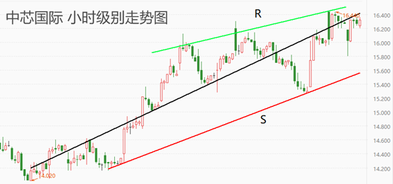 技术角度看,中芯国际的小时级别走势图处于多头趋势之中,上方的阻力线R和下方的支撑线S之间留有足够的空间,两者短期内交叉的概率不高,意味着多头趋势还能延续较长时间。R线距离中轨较近,潜在上涨空间较小。S线距离中轨较远,如果今日K线出现筑顶迹象,小时级别可能展开中等幅度的跌势。