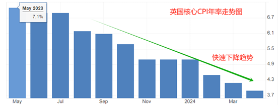 历史数据看,英国核心CPI年率数据处于快速下降趋势。2023年5月份,核心CPI年率高达7.1%,今年4月份读数下降至3.9%,12个月时间下降3.2个百分点,平均每月下降0.27个百分点。正是由于英国的CPI数据快速下降,才导致市场预期与前值相比差距较大,使得公布值介于前值和预期值之间。