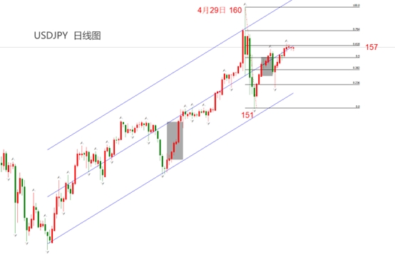 上图为USDJPY的日线图。经历中期回调之后,2023年末USDJPY触底反弹。以当时的阶段性低点140和当前的高点160计算,累计涨幅约14.29%。技术角度看,USDJPY仍处于上升通道内部,多头趋势延续。市价已经来到了通道中轨附近,且距离0.618分位较近,双重阻力影响下,USDJPY短线存在下跌压力。