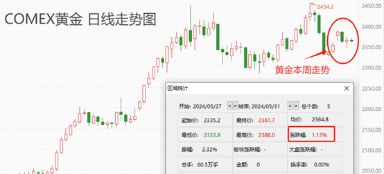 本周五个交易日,黄金在前两个交易日分别实现0.77%和1.18%的涨幅,并且周二开盘时向上跳涨。周三出现0.8%的小幅回调,周四微涨0.02%。今日盘中形成小阴线,但美盘时段才能决定全天的K线形态。本周累计涨幅1.13%,已经表现出小幅走强的特征。如果下周欧美股市延续普跌格局,黄金可能实现更大涨幅。黄金最新报价2361美元,距离历史最高点2454美元较近,处于相对高位。4月份至今,黄金已经在2300~2400之间震荡两个月,表明多空双方仍犹豫不定。即便存在美股下跌的利多因素,金价可能也不会有特别亮眼的表现。