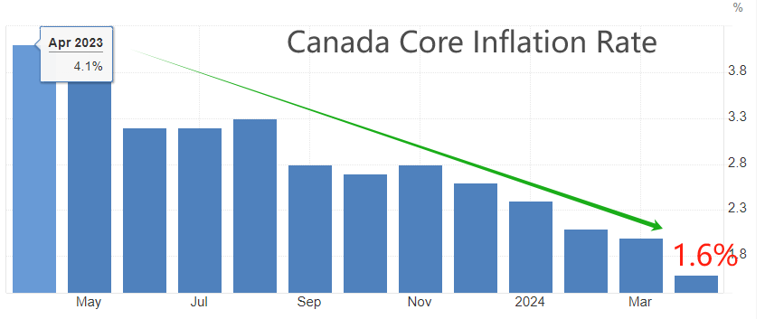 2023年4月份,加拿大的核心通胀率为4.1%,今年4月份最新核心通胀率为1.6%。12个月时间,核心通胀率下降2.5个百分点,平均每月下降约0.21个百分点。据此判断,加拿大的核心通胀率有可能在三季度跌破1%,年底前有可能进入负利率状态。想要避免通货紧缩局面的出现,加拿大央行必须启动二次加息。今年7月份和9月份,加拿大央行还将进行两次利率决议,我们认为,两次决议均宣布降息25基点的概率较高,USDCAD将受到利多提振。