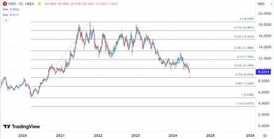周大福最新业绩逊于预期,虽然同店数据好转但毛利率有所下滑,且在2025年度财政指引和派息方面缺乏惊喜,对于前景用了“审慎乐观”的描述,也反映珠宝行业竞争更加激烈的现状,股价未能获得业绩的提振反而加深跌幅,10日均线也在9.6港元充当阻力,在市场信心不足下仍有更多下试空间,若日内收低于8.6港元可能很快跟进至7港元的低位。