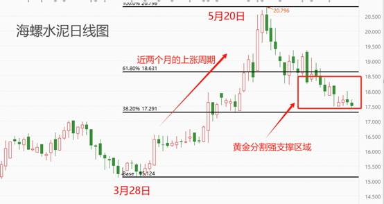 图2为海螺水泥的日K线走势图。日线级别的K线与月线级别的K线结构类似,都是在经历一轮大涨之后进入回调期。3月28日至5月20日,也就是今年的二季度,海螺水泥股价出现了一轮上涨期,主要是因为中国的CPI数据摆脱了负增速,从二月份开始进入正值状态,市场对经济前景的预期有所好转。5月20日之后,经济数据持续好转的态势没有延续,开始横向波动,市场乐观预期转淡。截至目前,累计回落幅度接近15%,市价已经逼近0.618黄金分割位,未来1-2周寻得有效支撑的概率较高。需要提醒的是,0.618分位有可能会被跌破,类似于海螺水泥月线级别的走势。如果未来行情对0.618分位的突破不是“长阴线”“连续阴线”“跳空”等有效信号,则假突破可能性较大。