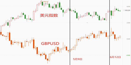 5月9日至6月12日,GBPUSD日线级别出现一轮流畅的涨势,市价从1.2444上涨至1.2859,累计涨幅415基点。这段时间,美元指数进入回调态势,主要是受到非农就业报告和CPI数据的利空影响。仔细对照可以发现,GBPUSD和美元指数的日线走势共振性极强,美元指数下跌时,GBPUSD大概率上涨;美元指数上涨时,GBPUSD大概率下跌。所以,GBPUSD过去一轮的上涨并非由英国经济或者英央行主导,而是由美元指数主导。6月12日之后,GBPUSD进入回落态势,目前最低价已经进入0.618~0.382的强支撑区域。最近三日连续收阳,GBPUSD在本周整体维持反弹态势的概率较高。