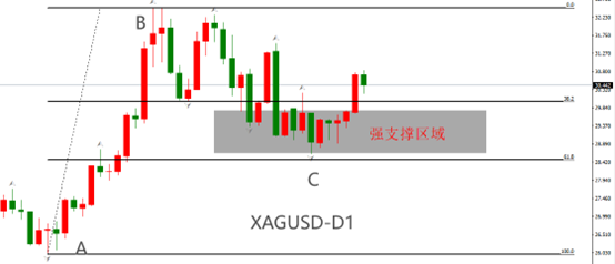 5月2日(A点),伦敦银开启涨势,并于5月16日创出历史新高。5月20日(B点),伦敦银涨至阶段性高点,市价触及32美元/盎司。这段时间的上涨主要归功于同时期美元指数的剧烈下跌。5月20日之后,伦敦金开启回调走势,期间最低触及28美元(C点),并在C点处形成底分型支撑结构。技术角度看,白银的(28.5美元~30美元)是强支撑区域,也是黄金分割0.382~0.618所在的区域。银价在此处寻得支撑,意味着后市的上涨比较健康,冲击前期高点32美元的概率较高。
