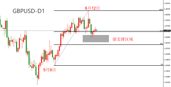 5月9日至6月12日,GBPUSD日线级别出现一轮流畅的涨势,市价从1.2444上涨至1.2859,累计涨幅415基点。上涨的主要驱动因素是美元指数的走强。6月12日之后,GBPUSD进入回落态势,目前最低价已经进入0.618~0.382的强支撑区域。昨日短线冲高后,今日亚盘有回落迹象,但市价依旧位于强支撑区域上方。考虑到晚间存在英央行利率决议这一重磅事件,GBPUSD今日的波动幅度可能会很大。保持基准利率不变利空英镑,GBPUSD向上突破的概率较高。