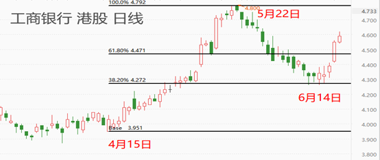 6月14日,工商银行港股股价触及0.618强支撑区线,随后启动反弹,截至今日实现五连阳,累计涨幅超6%。5月22日至6月14日的回调波段,有回调过度的迹象,意味着空头力量比此前预期的强势。虽然当前涨势剧烈,但本轮上涨能否突破前期高点4.8港元仍存疑,预计难度较大。