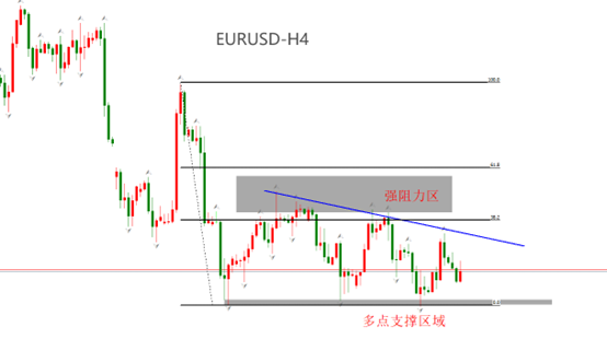 EURUSD对美国重要经济数据的反映最敏感。四小时级别看,EURUSD形成下降三角形结构,多点支撑区域在1.0666附近,一旦该支撑被突破,后市展开迅猛降幅的概率较高。下降整理三角形的最高点,反弹至前一轮下跌的0.382~0.618区域内,该区域被称为强阻力区,在该区域内启动下跌走势,跌势会更为健康、持久。如果晚间数据超出市场预期,比如公布值高于前值,则EURUSD受到利多提振,反弹行情可能导致市价短暂突破蓝色下降趋势线,交易者需对此做好准备。