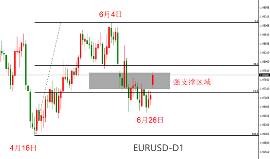 上周五公布的美国5月PCE数据显示,名义值低于前值0.1个百分点,核心值也低于前值0.2个百分点。通胀率持续下降,意味着美国的通胀数据已经摆脱平台期。按照当前的平均下降速度看,今年下半年至明年上半年,美国通胀率下降至2%目标区间的可能性较高。美联储货币政策对PCE数据表现异常敏感。5月PCE数据下降,美联储官员大概率会发飙偏鸽派言论,美元指数将在7月份持续受到利空冲击。EURUSD周一跳涨,就是基于美联储降息预期增强美联储官员态度由鹰转鸽的判断。