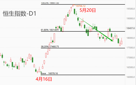 虽然银行板块的强势状态对于恒生指数、上证指数具有提振作用,但由于房地产板块的跌幅更显著,导致大盘指数很难与银行板块指数共振性走强。技术角度看,恒生指数在5月20日开始回调,截至目前累计跌幅超8%;上证指数在同一天开始回调,截至目前累计跌幅超5%。两者的市价均已进入0.382~0.618的强支撑区域,目前筑底结构尚未出现,0.382分位能否起到有限支撑作用仍存不确定性。