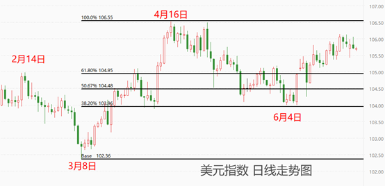 3月8日至4月16日,美元指数经历一轮流畅的上涨走势,最高价触及106.52点,创出年内新高。4月16日之后,随着降息预期增强,美元指数进入回调状态。在美联储多位官员持续发表鹰派讲话,叠加美国的CPI数据和非农数据表现靓丽,美元指数受提振并在6月4日寻得有效支撑,当日最低点103.99点。该点位符合0.618的黄金分割强阻力的要求,预示后期反弹会比较顺利。截至目前,美元指数仍处于6月4日以来的上涨波段。今日晚间的ADP数据会对美元指数的走势形成影响,如果公布值符合预期,意味着劳动力市场表现平稳,美联储降息预期受抑制,美元指数受提振。