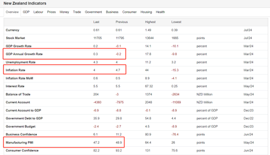 本周三10:00,新西兰联储将公布7月货币政策决议结果,市场普遍预期其将维持5.5%的官方现金利率不变。经济数据角度看,新西兰一季度GDP年率增速为0.3%,前值为-0.2%,虽然有所提高,但仍处于零值附近,宏观经济有衰退风险;一季度通胀率4%,大幅低于前值4.7%,高通胀问题显著缓解,但按此降幅估算,新西兰有可能进入通货紧缩周期;制造业PMI为47.2,前值48.9,均低于50的荣枯线标准,制造业表现疲软。总的来看,新西兰经济前景不乐观,当通胀率降低至3%以下后,新西兰联储降息概率较高。现阶段维持限制性高利率不变的可能性最大。