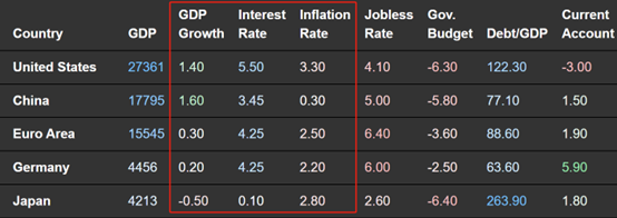 排名前五的国家/地区的GDP增速介于-0.5%~1.6%之间,处于较低水平,意味着全球经济没有处在高增长状态,随时有进入衰退的可能,这从大方向上利多黄金。名义通胀率介于0.3%~3.5%之间,大部分国家的通胀率在2%上方,处于温和通胀状态。传统分析逻辑认为,通胀率越高,黄金的保值属性越强。基准利率介于0.1%~5.5%之间,大部分国家的基准利率高于3.45%。平均基准利率大于平均通胀率,意味着货币市场收益能够抵消物价的增幅,这一点不利于黄金保值属性的激发。综合来看,全球经济温和增长,部分国家陷入衰退,目前的黄金的保值属性未被全部激发。
