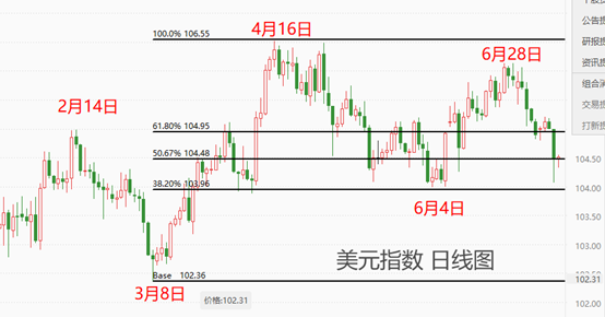 6月份CPI数据使得美元指数跌破0.382分位的重要支撑,市价在0.5分位处收盘,留下较长的下影线。4月16日和6月28日的两个高点,形成M顶结构。6月4日成为M顶结构的颈线位。昨日长阴线并未触及颈线位置,并且在颈线位上方不远处形成长下影线,似乎表明颈线位具有较强的支撑作用。考虑到美联储降息预期一直存在且不断增强,即便颈线位具有较强的技术性支撑,本月向下突破颈线位的可能性仍然较高。