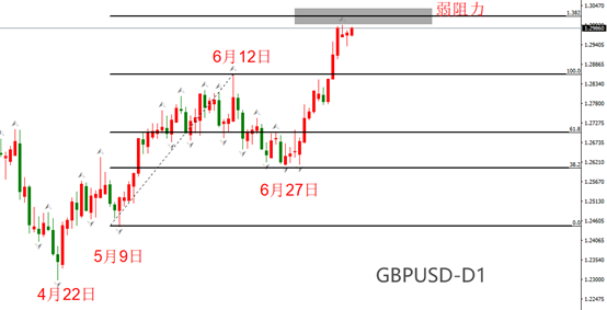 日线级别看,GBPUSD已经连续6日收阳线,英镑的升值势头异常显著。5月9日至6月12日,爆冷的4月非农数据对美元指数形成严重冲击,反向提振了GBPUSD。5月和6月的非农数据表现靓丽,降息预期降温,美元指数走强,GBPUSD又进入回调状态。6月27日至今,随着特朗普胜选的概率越来越高,金融市场的避险情绪重新被激发。市场预期美联储将会在9月份启动首次降息,甚至某些激进的机构预期本月底美联储就会启动首次降息。降息预期一直是抑制美元指数走强的核心因素。随着9月和7月降息预期的升温,美元指数的短期回调正演变为中期跌势,GBPUSD受益。技术角度看,GBPUSD涨幅已经比较大,即将进入强阻力区1.3018~1.3116。一旦有某些经济数据导致美联储降息预期减弱,GBPUSD的回调随之来临。