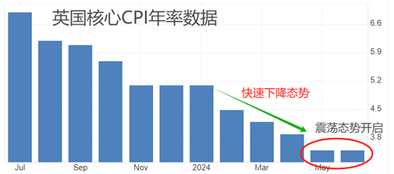 核心CPI数据更被英国央行看重。5月份之前,英国的核心CPI年率处于快速下降态势,从今年1月份算起,平均每月降幅达到0.4个百分点。6月份数据与前值持平,意味着上半年形成的快速下降状态已经终结,横盘震荡态势即将开启。果真如此的话,英国央行降息的紧迫性将大打折扣,因为3.5%的通胀率仍然远高于2%的温和通胀标准。如果通胀率不继续下降,2%的通胀目标将迟迟无法实现。甚至于,通胀率迟迟不下降,英国央行有可能重启加息进程,这将对英镑币值形成显著提振。