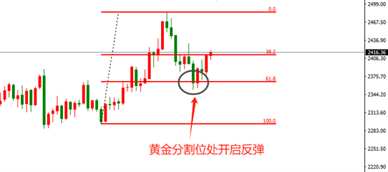 上图为XUAUSD日线走势,7月25日回调波段触及最低点2352美元,该价位处于黄金分割位0.618附近。从上周五和本周二的长阳线来看,支撑位有效,反弹行情延续概率较高。