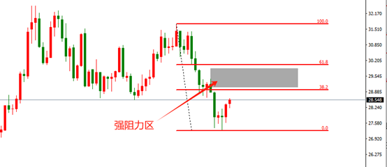 上图为XAGUSD日线走势图。白银的技术走势偏向中期空头,本周开始的上涨更像是反弹而不是反转。强阻力在黄金分割位处,区间为28.96美元~30美元,一旦市价进入该区间,可能导致短线获利盘了结或者中长期看空资金入场。长周期看,黄金和白银趋势相同,并且黄金的关注度、交易量更高,走势更可靠,一般作为白银走势的前瞻指标。对于中短周期来说,两者经常出现反向行情,一般情况下,白银最终的涨跌反向会跟随黄金。基于此,白银虽然技术面呈现出空头结构,但仍有创新高的可能。