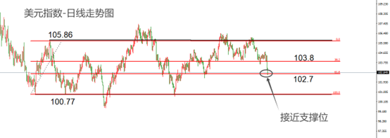 2023年2月份以来,美元指数进入震荡区间,上限105.86,下限100.77点。7月份开始,美元指数处于从震荡区间上限向下限运行的过程汇总,0.382分位处经历小反弹后最终被有效跌破。目前市价运行至0.618黄金分割位处,有可能出现如0.382分位处类似的回踩特征。不过,行情最终向震荡区间下限100.77运行的中期趋势大概率无法避免。