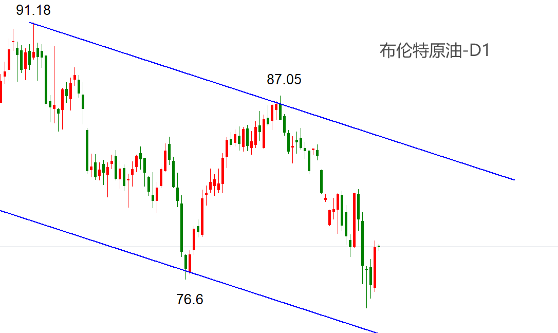 今年4月份,WTI价格尚在86.97美元高位,到了6月份,价格下跌至72.44美元,至今日报价80.13美元,80美元整数关口随时有被突破的可能。从72.44开始的反弹,持续时间虽长,但最高点仅达到84.49,未创新高。目前市价运行于图中蓝色下降通道线内部,中长期内有触及通道下轨的可能性。