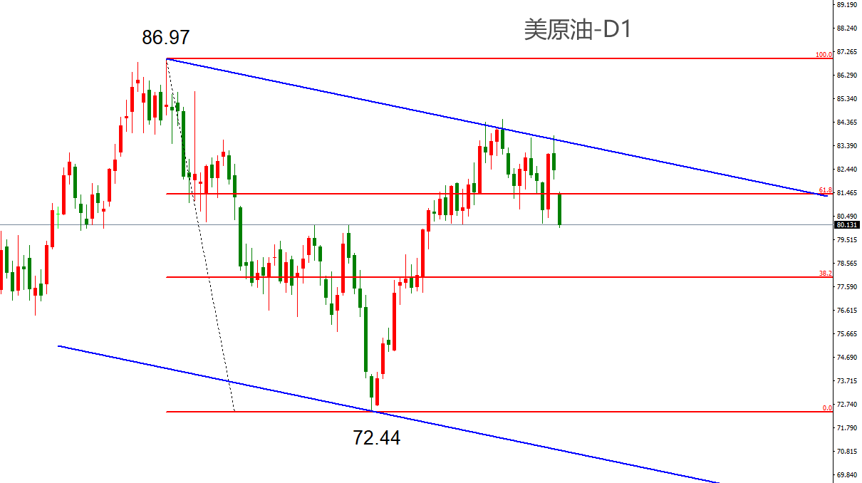 短周期来看,WTI跌势显著,83.79美元至今的跌幅已经完全回吐了此前的涨幅。最新市价80.13美元,处于前期低点80.2美元附近。一旦该点位被有效跌破,下方将不存在明显支撑位位,预计后市大概率将会出现相对流畅的下跌波段。
