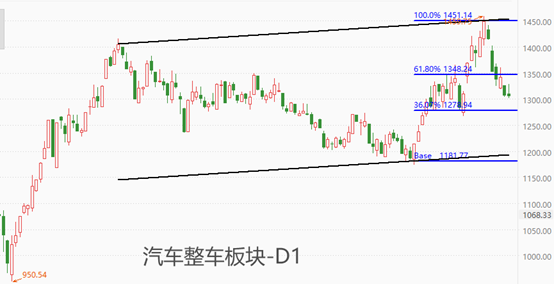 通胀率发布后,A股市场的汽车整车板块并未表现出明显异动,全天涨跌幅不足1%。经历7月份的持续上涨后,8月份启动回调走势,截至目前市价进入强支撑区域0.382~0.618,后市可能短期筑底。中长期来看,汽车板块指数处于月线级别的历史峰值区间,如果没有超预期数据出现,后市将在技术面因素的驱动下开始下跌,直至进入历史谷值区间。