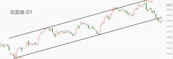 比亚迪在港股和A股市场两地上市,且总市值位列汽车整车板块第一名,对汽车板块的走势具有重要影响。今年2月份至今,比亚迪的股价一直运行于上升通道内部,直至本周二才有效跌破通道下轨。今日比亚迪股价反弹2.34%,但最高价依旧处于通道线下方,意味着中期的上涨走势即将结束或迎来调整。
