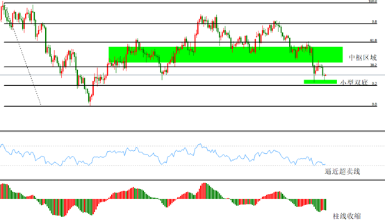 日线级别看,走势结构方面,8月5日长下影阴K线和昨日十字星,构成小级别的双底结构,后市存在反弹可能性。市价已经跌破0.618分位,处于中枢区域下方,如果震荡格局延续,市价将向中枢区域回归。