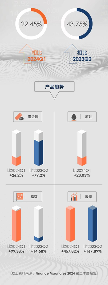 与上一季度相比,ATFX的交易量增长了22.45%,较去年同期更是激增了43.75%,展现出惊人的发展速度和无限潜力。从细分产品来看,贵金属类别交易量较2024年第一季度增长了26.2%,较2023年第二季度增长了79.2%;指数类别交易量较2024年第一季度增长了99.38%,较2023年第二季度增长了14.58%;股票类别交易量较2024年第一季度增长了457.82%,较2023年第二季度增长了167.89%;能源类别交易量较2024年第一季度增长了23.03%。