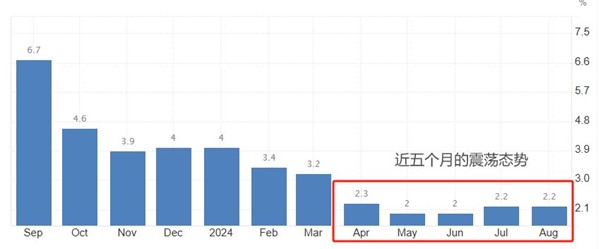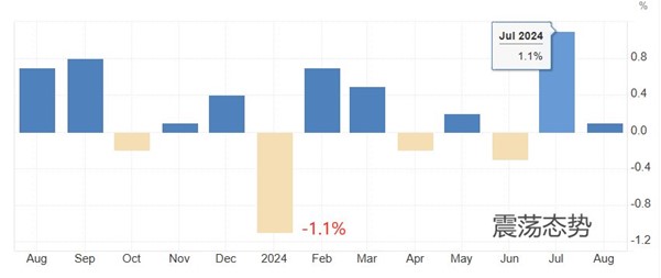 本周三14:00,英国国家统计局将公布英国9月CPI年率数据,前值为2.2%,预期值1.9%,预期将下降0.3个百分点。英国的通胀率数据已经基本保持稳定,过去五个月,通胀率上限2.3%,下限2%,差值仅为0.3个百分点。本次市场预期的1.9%已经跌破下限,不符合当前的震荡态势,最终公布值可能与预期值有偏差。美联储认为核心通胀率能够更准确的反应物价水平,所以市场人士对于英国的核心通胀率关注度在上升。市场预期英国的9月核心CPI年率将从3.6%下降至3.4%,但最终值仍远高于温和通胀标准2%。8月份,英国央行首次降息,降息幅度25基点,降息时间点和幅度均滞后于美联储和欧央行。主要原因在于,英国的核心通胀率仍偏高,如果大幅度降息,英国的高通胀问题或卷土重来。