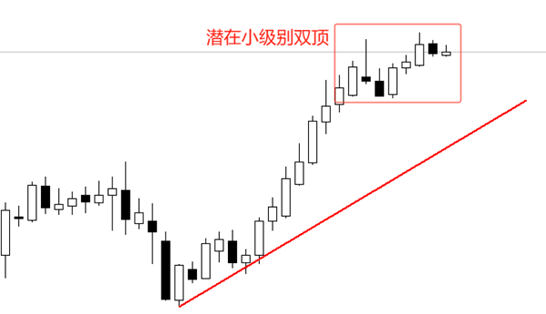 日线级别看,USDCAD的多头趋势力度较强,但10月15日的长上影线提示空方力量正在集聚。10月21日,K线的上影线较长,似乎与10月15日的长上影线形成双顶结构。如果最近一段时间市价不能创出本月新高,双顶结构可能将发挥作用,对当前的涨势形成严重抑制。