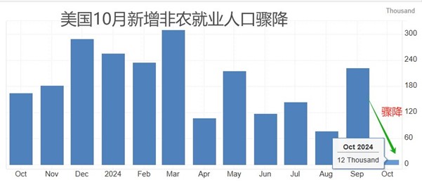本周五3:00,美联储将公布11月利率决议结果,主流预期认为基准利率将从5%下调至4.75%。根据CME美联储观察的数据,本月降息25基点的概率高达97.7%,可以用“板上钉钉”来形容。上周五公布的10月份非农就业报告显示,新增非农就业人口从25.4万人骤降至1.2万人,远远低于市场预期的11.3万人。表现不佳的非农数据意味着美国宏观经济仍有硬着陆可能,这将进一步刺激市场人士对美联储降息的预期。需要提醒的是,本周五的美联储利率决议仍有可能延续50基点的降息幅度,虽然这种情况出现的概率较低。